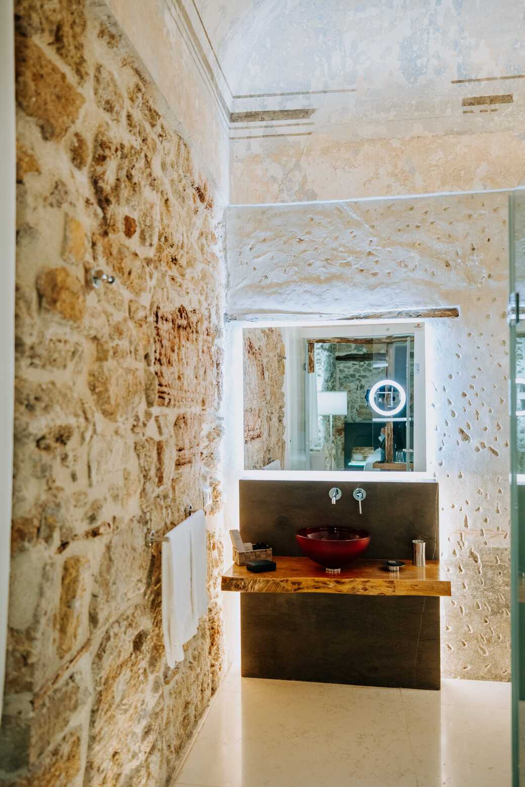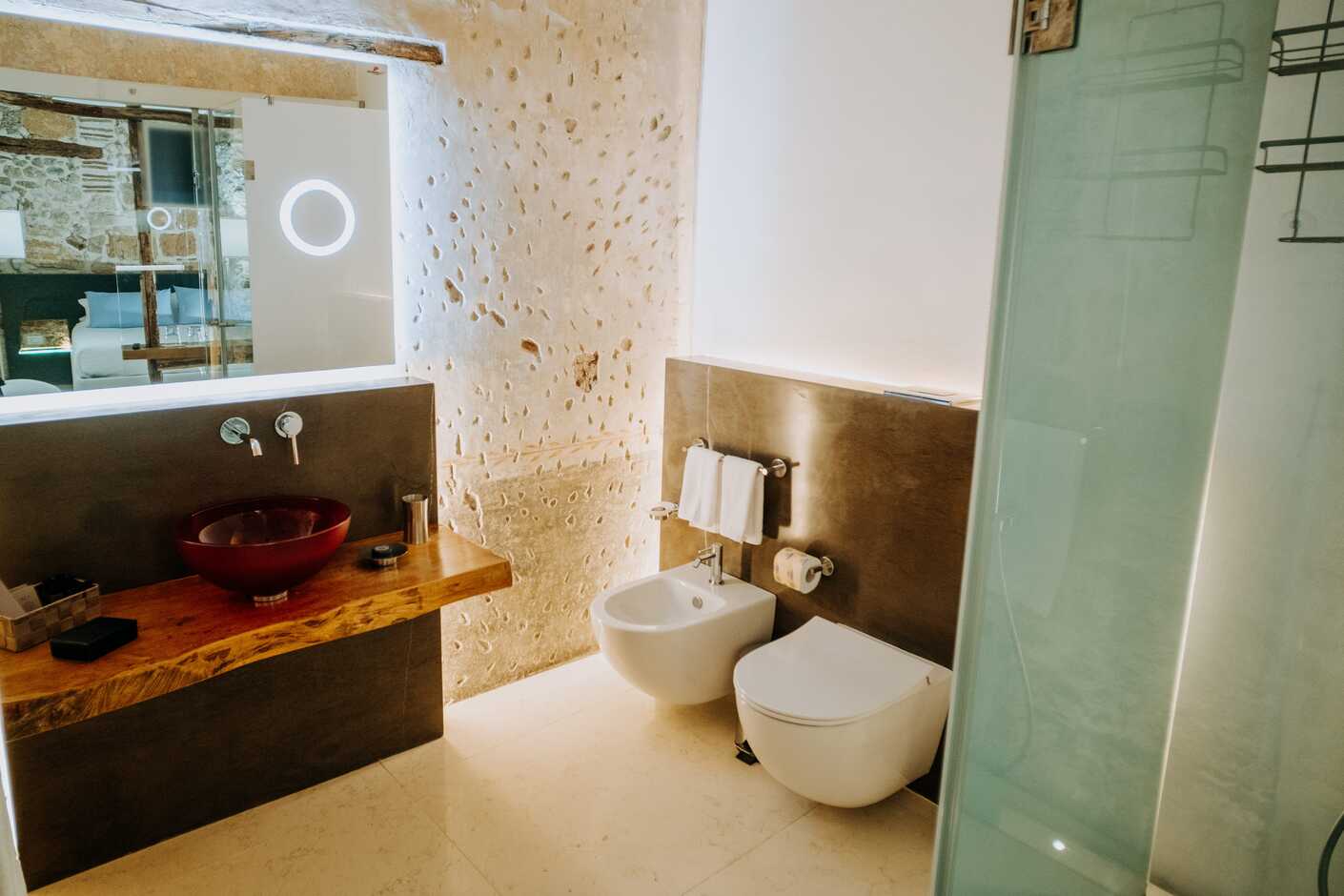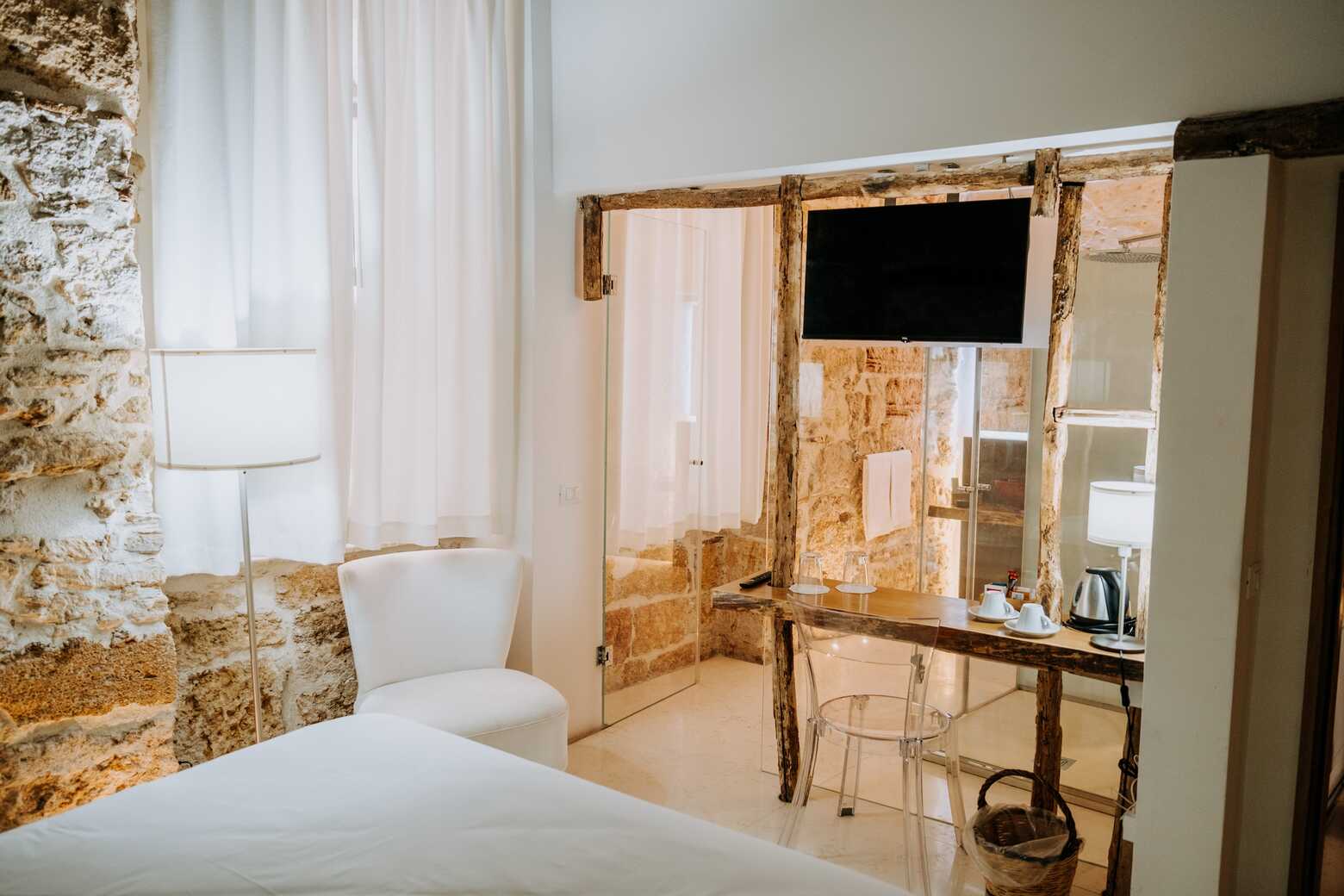La stanza si affaccia, con due ampie aperture, su un cortile rinascimentale interno in cui ha sede una sala museale. La parete divisoria tra la camera e il bagno, in vetro, ha mantenuto l’originaria struttura intelaiata dei tramezzi del periodo seicentesco, con l’inserimento ad hoc della scrivania. Faretti a pavimento e luci led che esaltano le pareti in vetro danno rispettosa luminosità all’ambiente. Il pavimento in pietra naturale, Biancone delle Alpi, sovrasta l’impianto di riscaldamento/condizionamento accuratamente occultato ai fini del comfort visivo.