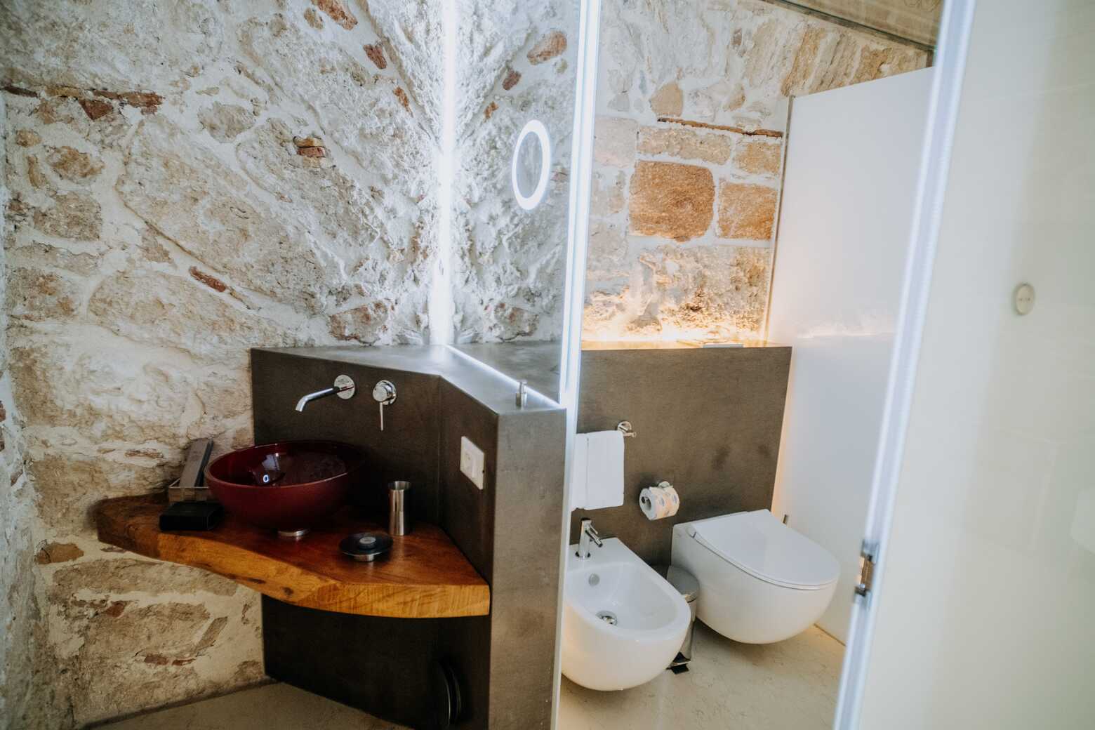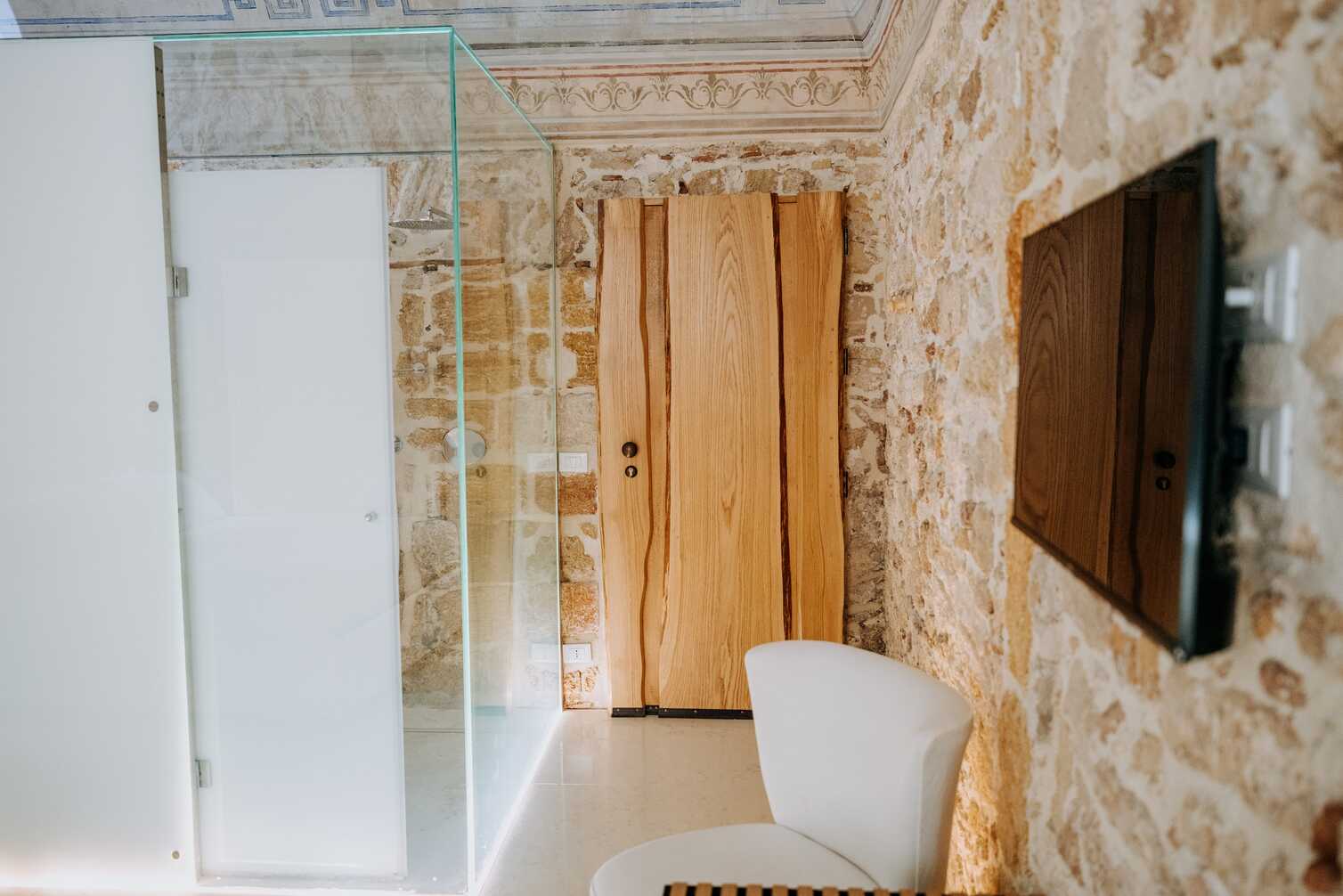 In un ambiente restaurato, la camera offre un bagno in vetro con zona servizi oscurata per la privacy e un tetto trasparente che garantisce abbondante luce e vista panoramica. Gli elementi minimal, in acciaio, cristallo e tronco di castagno, si riflettono nel lavello, nel ripiano e nella porta in legno di castagno e rovere. La stanza è arredata con un letto king size, poltrone e scrivania, mentre faretti a pavimento e luci led esaltano le pareti in vetro e il pavimento in pietra naturale (Biancone delle Alpi) nasconde l’impianto di climatizzazione. Un’ampia apertura conduce a un antico balcone, dove alberi di limone incorniciano la vista della cattedrale, visibile anche dalla doccia tramite un sapiente gioco di specchi.
