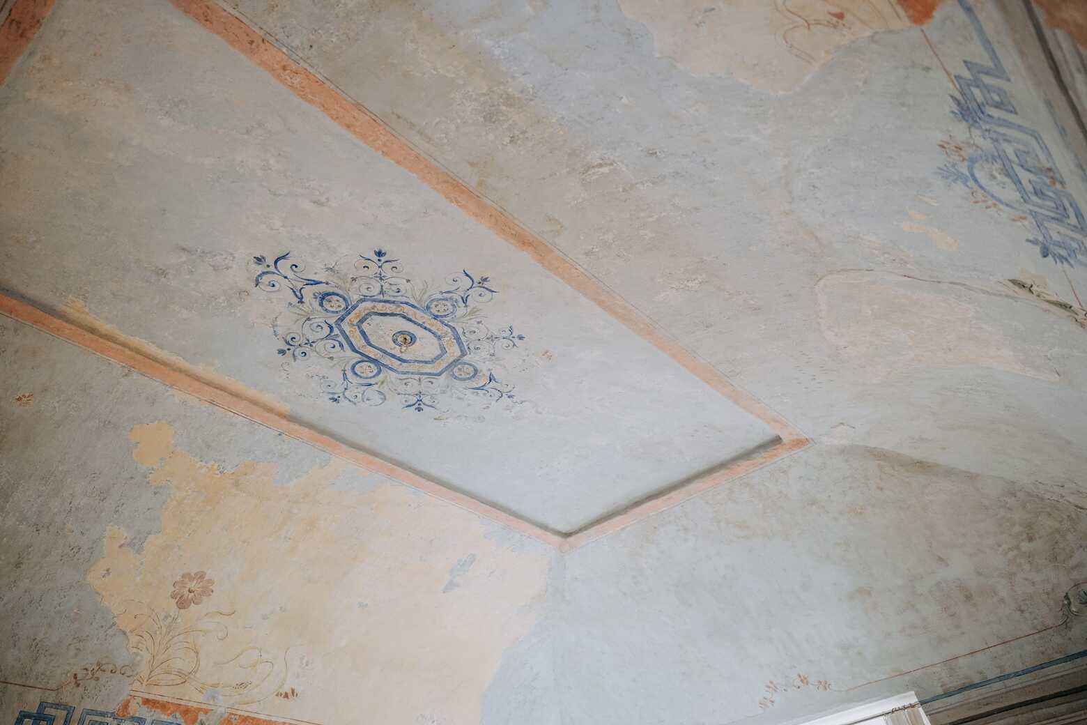 La camera di 27 m² vanta una volta reale a specchio interamente affrescata. Le mura a vivo rivelano imponenti archi strutturali, uno dei quali abbellisce il letto come capezzale. L'ambiente si distingue per sette sovrapposizioni di affreschi, con intricati lacerti sapientemente restaurati.